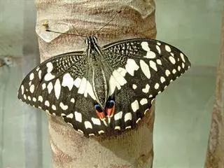 This is a large butterfly with a wingspan of 8cm (females are slightly bigger than males). Adults have grey-black wings with white markings. The hind wings have two black, blue and reddish-orange ‘eyespots’. The caterpillar is a serious pest of many species of citrus. While young, it resembles a bird dropping, and can easily be overlooked. As it matures, it turns a uniform green.
