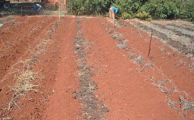 After turning the plot with a fork, place pegs 1,3m to 1,5m apart at each end. String parallel lines to the pegs on opposite sides of the land. Pull a hand hoe along each line to mark the walkway.