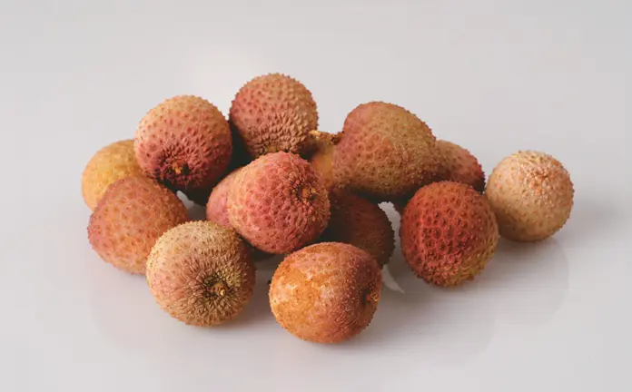 The litchi is an evergreen tree up to 20m high and bearing fleshy fruits. The outside of the fruit is covered with an inedible, pink-red, roughly textured rind, easily removed to expose the sweet, translucent, white flesh.