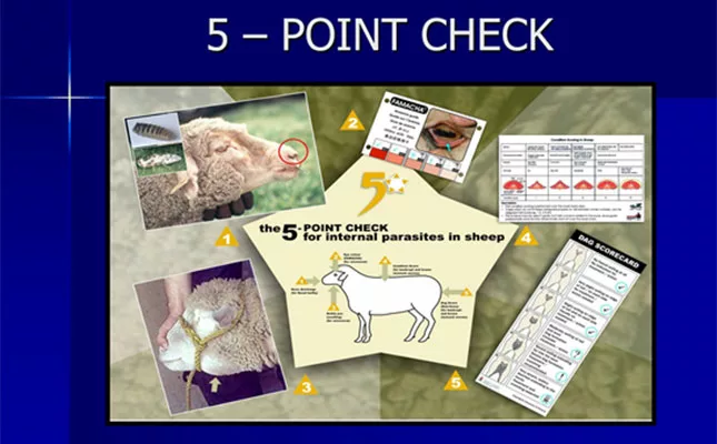 With the Five Point Check, farmers are encouraged to regularly examine the eyes, nose, jaw, tail, and back of each animal to identify parasite or disease problems.