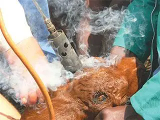 Here, the horn-forming tissue at the base of the hornbud is burnt with a de-budding iron, which is heated by gas or fire. This should be performed when the calf is three to six weeks old.