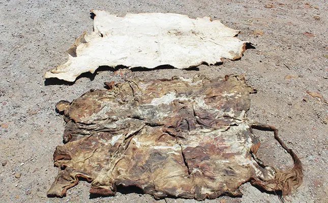 The well-salted dry hide (above) is superior to the poor-quality sun-dried hide (below).