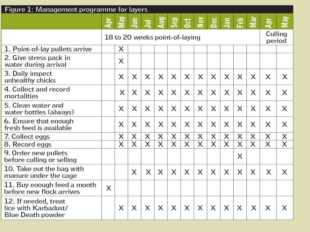 To do all this successfully you will need a management calendar. This is simply a reminder of what you need to do to make sure your chickens are healthy and producing eggs as they should. A calendar like this is a powerful management tool, and well worth the effort of keeping up to date.