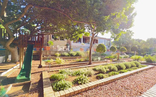 There is an ornamental garden at the front of the house, with a swimming pool and loungers to the side. There’s also a children’s slide and tree house.