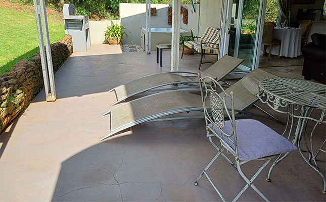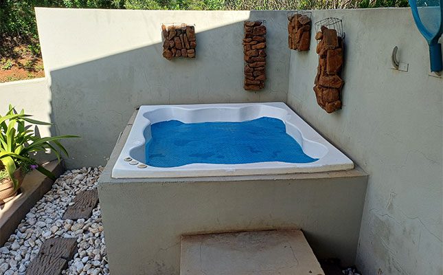 The second area comprises the bedroom with a large bathtub, shower and basins, and a toilet and bidet in a separate room. There is also an outside shower. The patio has comfortable deck chairs from where guests can enjoy the views, and it also leads to the braai and Jacuzzi.