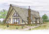 Here is the layout and sketch of your revamped house. As can be seen, I’ve kept all the plumbing along the south-east wall and the outside area to the north-west. This is the sunny side where entertaining can be done. With the lounge being rather small, the new outside verandah will ease any congestion. It can have blinds and a full covered roof if necessary. Thatching is only over the existing house and the added bedroom. The existing tin roof can be re-used over the garage, scullery and verandah. As all the house corners are square, the thatching should have rounded corners. The timber log posts on the corners create that essential 135° corner, as well as adding character to the house.