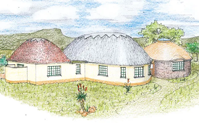 It is important that the construction of the roof is certified by a professional structural engineer. The 4,5m x 4,5m rooms can be built individually as time and finances permit. Shown in the perspective is a mixed version of the various shapes and styles that can be contrived with a bit of imagination. The walls can be smooth-plastered or have a moulded tyre finish.