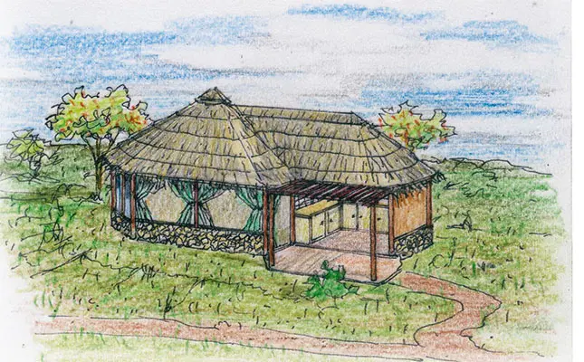 I suggest that the buildings be rustic but substantial: a simple vertical and horizontal poled structure on a solid foundation, with on-site wall materials and a thatched roof with chicken mesh for monkey-proofing. This is better than a tented unit, which would require more upkeep in the long run.