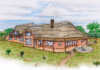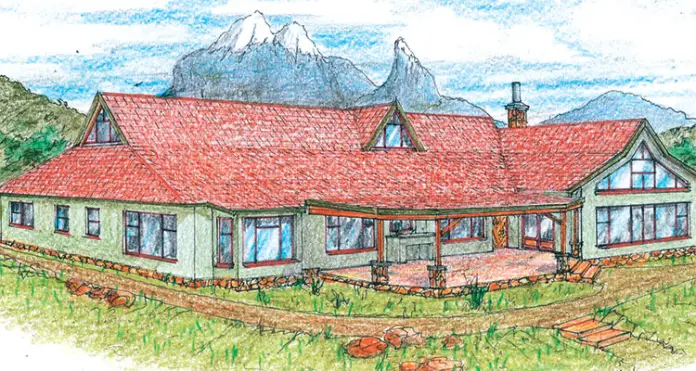 The sketch depicts the front facade of the house, with the mountains in the background. However, when constructed, the house will face front- to-back for a better view of the mountains. The house can also be built left-to-right to suit the orientation of the views, sun and slope of the land.