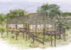 A combination of sketch layouts from the manager and his associates and friends has culminated in the sketch shown here. I’ve attempted to utilise as much of the present structure with foundations as possible in order to limit the total cost. The existing house is shown in darkened walls and dotted where removed – new work is in red.