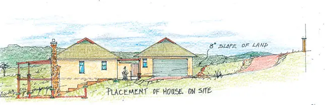 Shown in the sketch are the home’s position on-site and a side elevation, depicting its practical placement on the 8° slope. The elongated driveway provides access to the garage, which is at the same level as the main house.