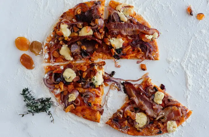 - Topping time. Your oven has reached maximum velocity, and your pizza base is nicely thawed and laid out on a floured baking sheet. Add a layer of caramelised onions, then the diced dried fruit and the crispy bacon, and finally the Gorgonzola, sliced as thick as you like. Place the pizza in the ultra-hot oven and keep an eye on it for about seven minutes.
