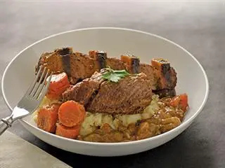 Preheat the oven to 150°C. Prepare a light flour coating for the beef ribs by pouring the following into a large, unused plastic bag: a tablespoon of coarsely ground black pepper, a teaspoon of salt and the 150g of flour. Shake to mix these ingredients. Add the beef ribs, one at a time. Hold the bag shut and shake it well to coat the raw beef ribs evenly in seasoned flour.