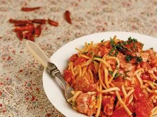 Pancetta, a cured pork product, also comes in local and imported versions. If neither is available, bacon is an acceptable stand-in. The nationality of the rest of the ingredients is no big deal. Dried chillies, crushed or uncrushed, are easily located. If capsicum heat is an issue, carefully remove the pips before cooking.