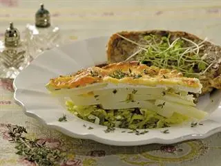 Grease up the interior of a ceramic or glass baking dish then add the cabbage and potatoes plus the two cheeses. Select a mixing bowl and combine the milk, crème fraîche or plain yoghurt (your choice), 5g salt and a generous sprinkling of black pepper. Stir this to combine the ingredients, then pour it over the cabbage and potatoes in the dish.