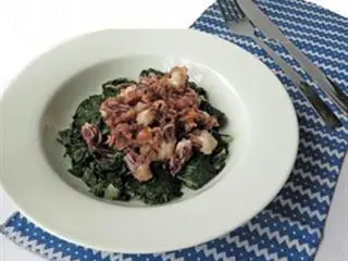 Arrange a layer of spinach on each plate and a couple of spoonfuls of calamari on the top. Serve at once, with lemon chunks available to each diner and the optional marine sauce. You can make this sauce very quickly by stirring in two tablespoons each of mayonnaise and tomato sauce, plus a teaspoon of Worcestershire sauce or light soya sauce.