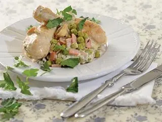 Take the casserole to the table so that the diners can be amazed by the carpet of parsley, and serve with white rice, couscous or pasta of your choice. Bon appétit!