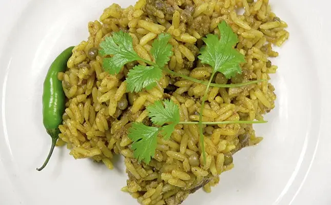 When ready, combine the contents of the frying pan with the boiled rice. Stir well, garnish with fresh coriander leaves and serve to roars of applause.