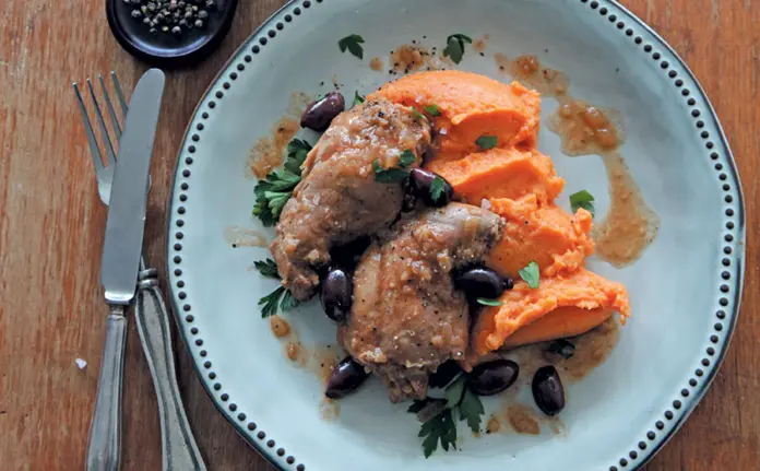 4. Rev up the hob to medium-high and boil the pan liquid until it begins to thicken. Add the depipped olives. Return the rabbit to the pan, bring everything gently back to a comfortable serving temperature, and plate the contents equally amongst the diners.