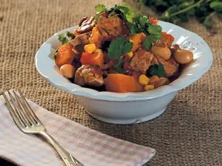 Sweat the onions and garlic in the remaining oil until the onions are soft and translucent. Return the browned pork plus the raw butternut to the saucepan, then pour in the litre of chicken stock.