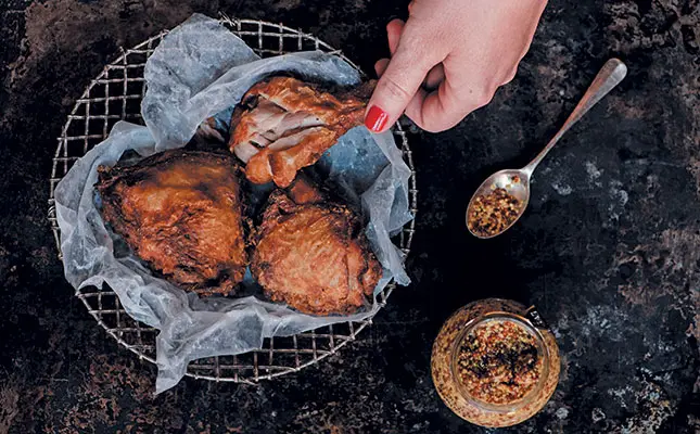 Drag two pieces of chicken through the flour and knock off the excess. With tongs, lower the chicken into the hot and dangerous oil and deep-fry for 20 minutes, turning every two minutes. Do the clear juice test to ensure the chicken is cooked right through. Remove, place on the rack and cook the other quarters.