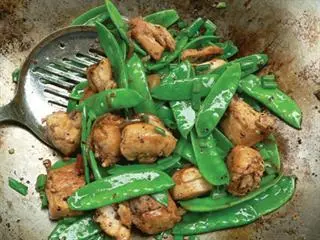 Separate the chicken from the soya sauce and sherry, and add to the very hot oil. Stir-fry for three minutes. Lower the heat, return the cooked onion to the wok and add the entire punnet of mangetout. Stir-fry for 90 seconds then pour in what’s left of the soya sauce and sherry mixture. Let this cook for 30 seconds, kill the flame and sprinkle freshly chopped spring onion greens over the contents of the wok.