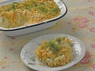 In a food processor, hyper-chop the flour and butter or even consider doing this messy but deeply fulfilling job by hand. Stir in the rolled oats, the sweated onion, the paprika and the grated hard cheddar. Spoon this mixture over the fish in its fragrant sauce and shove the entire construction into the preheated oven. Let this cook for 40 minutes or so, until the oaten crust is firm and light brown.