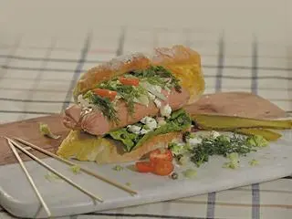 Then, onto this slightly sticky base, arrange a layer made-up of the mixed vegetables and feta. Top this in each case with a sprig of fresh fennel, which is as much for the visual effect as it is for aroma and flavour.
