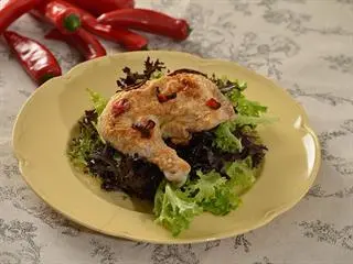 Chicken time. Cut the fowl into four equal pieces, excluding the back. Keep this in the freezer for chicken stock. Paint the chicken with the red chilli sauce using a pastry brush, then reserve under cover for five hours. Select a cast-iron frying pan and bring this up to high heat on the hob. Pour in a tablespoon of olive oil and add the chicken pieces skin side down. Salt lightly and cook for eight minutes a side, turning once.