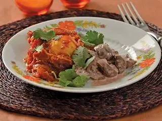 Slide the skillet into the oven and cook until the egg whites are firm and opaque. Place a half-teaspoon of crème fraiche at random over the exposed surface of the tomato, and garnish with a little chopped dhania plus the drop of Tabasco. Serve with a spoonful or two of the kidneys, and await a rousing ‘mazeltov’ from your ecstatic diners.