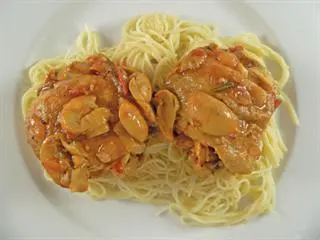 Add the depipped olives at this stage and let the simmering continue for another 10 minutes or so. Ensure that the chicken is cooked right through, with no red visible at the bone. The meal looks as good as it tastes. Complete the presentation by serving it with angel hair pasta, to soak up the splendid juices. Alternatively, mashed potatoes, sweet potatoes or butternut provide the juice-retaining qualities this meal demands.