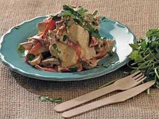 Select a large mixing bowl. Pour in the cooked amadumbe, the roasted mushrooms and sweet pepper, and, finally, the gloriously thick white sauce.
