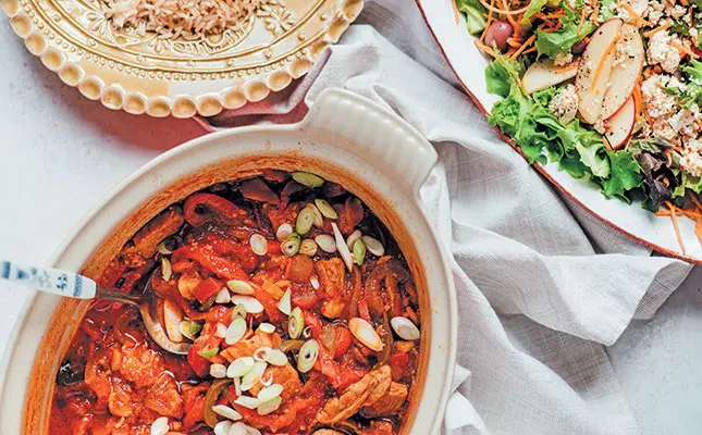 Let the casserole bubble quietly for 30 minutes or so with the lid on. Check at half time and add a little extra stock if its looking dry. Adjust the flavour with salt and pepper, garnish with the spring onions, then serve to your cheerful dinner party.