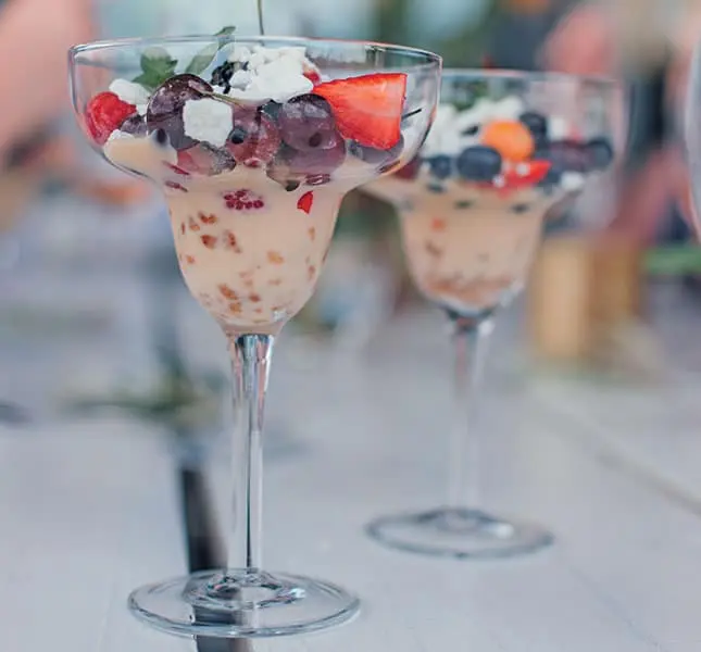 Cover the crushed biscuits with a generous ladle of the amarula custard, then layer the berries and fruit on top, and cover with another ladle of custard. Sprinkle the crushed meringue on top and garnish with a cherry and a sprig of mint.