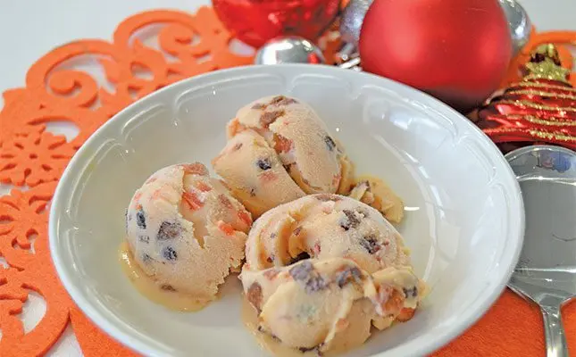 - Add the rum/fruit mixture, allow to cool, then churn in an ice cream machine. Alternatively, put it into a container in the freezer and mix by hand every 10 to 15 minutes.