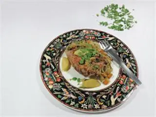 Pre-heat the oven to 90°C. Peel and thinly slice the onion. Peel, core and halve the two apples, then cut them into thin crescent-shaped slices. Lightly chop the fresh herbs. Pour the fruity white wine of your choice (either gewürztraminer or bukettraube) into a small saucepan and add the half-cup of sultanas. Over medium heat, let the contents simmer for three to four minutes, until the liquid is reduced by half. Remove and reserve under cover.