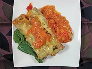 Add the tomato purée, a can of chopped tomatoes and a cup of water. Sprinkle over the rest of the chopped fresh oregano and stir well. Bring this rich tomato sauce up to a bubbling simmer for 10 to 15 minutes, then remove from the heat. Pour the tomato sauce into a large Pyrex oven dish. Using your hands, pack the hollow cannelloni tubes with the sausage meat and spinach mixture. Arrange the stuffed cannelloni tubes neatly in one layer in the oven dish, lying in the tomato sauce.