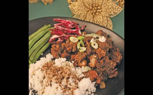- Deep-fry the pork belly in vegetable oil until crispy on the outside, and then cut the pork belly up into small cubes.