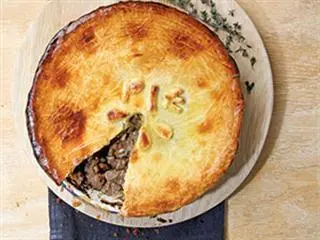 Roll out the pastry. Pour the cooked meat mixture into a pie dish. Place an egg cup in the middle for structural support of the pastry. Arrange a layer of shortcrust pastry over the entire contents, sticking it to the edges of the pie dish with a little added water.