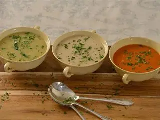 To make three quick soups in three colours for four lunchtime diners, you will need: