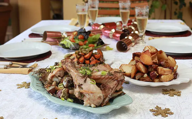 Carefully time the cooking. After 30 minutes, reduce the heat to 160°C. Spoon the pan juices over the turkey pieces. With an egg lifter, turn the potato cubes in their dedicated roasting pan.