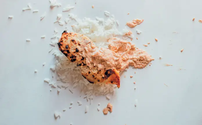 2. Rev your oven’s grill to the red line. Arrange the marinaded chicken breast sections on a baking sheet. Having ensured that the grill is as hot as hell at high noon, slide the baking sheet plus marinaded chicken under the blazing heat for four minutes. Turn the breasts, drench them in the residual marinade, and give them another four minutes, by which time they should be lightly browned. Ensure that the chicken is cooked right through, but don’t overdo it.