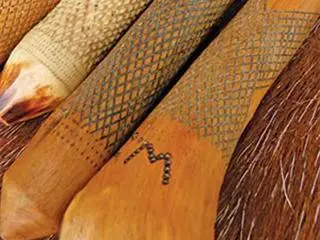 Umnquma sticks belonging to Gary Harvey. The continued use of oil on the sticks turns them buttery yellow over time.