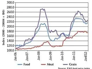 Since then, prices have slowed again. By February this year they were on average only 7,5% higher than the 2008 peak (see Figure 1). The decrease in global prices since August 2011 is seen by some as an indication that prices will now collapse to the pre-2007 level. However, while the volatility of global prices makes it difficult to forecast future prices, it’s clear the factors that have been affecting global food supply and demand over the past few years are all still present and will continue to drive prices in the future.
