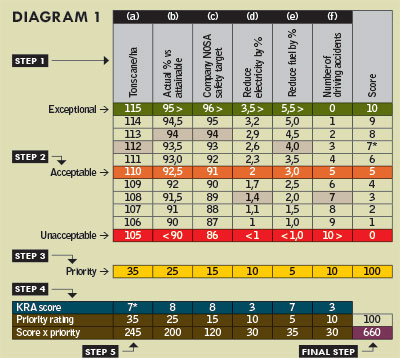 Writing your own ‘music sheet’ isn’t easy the first time round. I have experience with several systems, but by far the best for me has been the ‘objective matrix’ (OM) format. It might look complicated, but once grasped, it is easily understood by any literate employee. Referring to Diagram 1, follow these steps in setting up an OM for a manager in charge of transport on a sugarcane farm in the Lowveld.